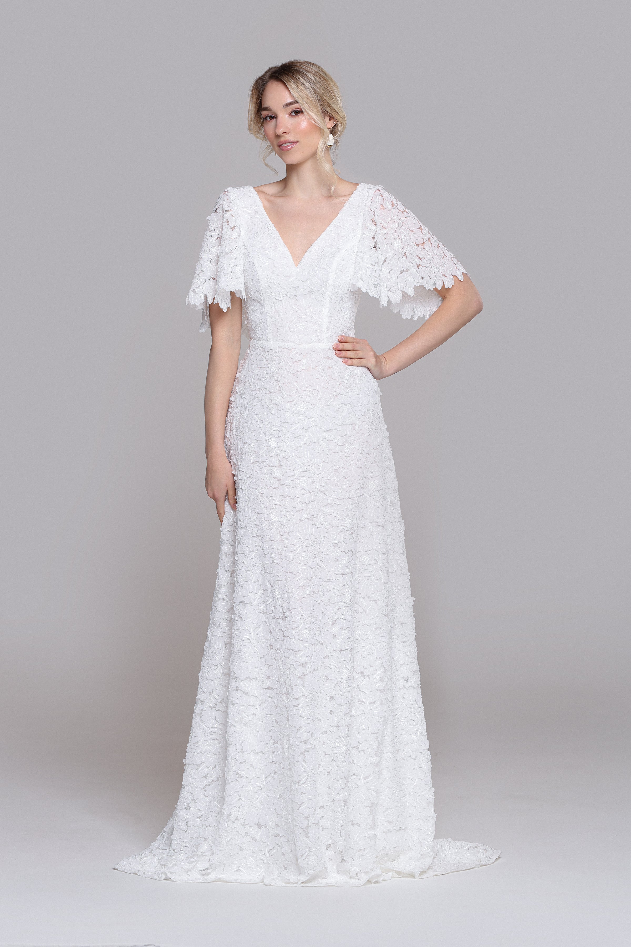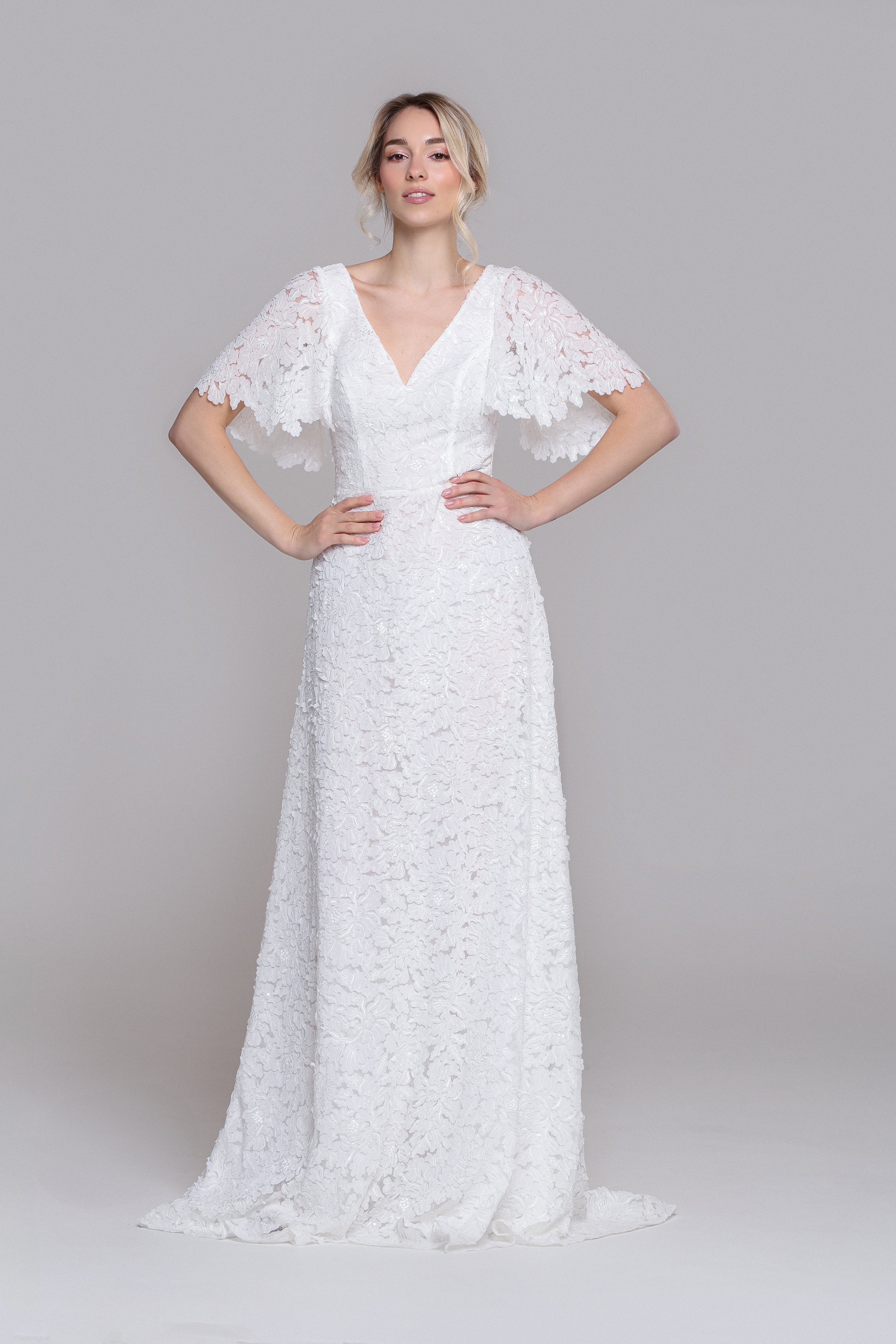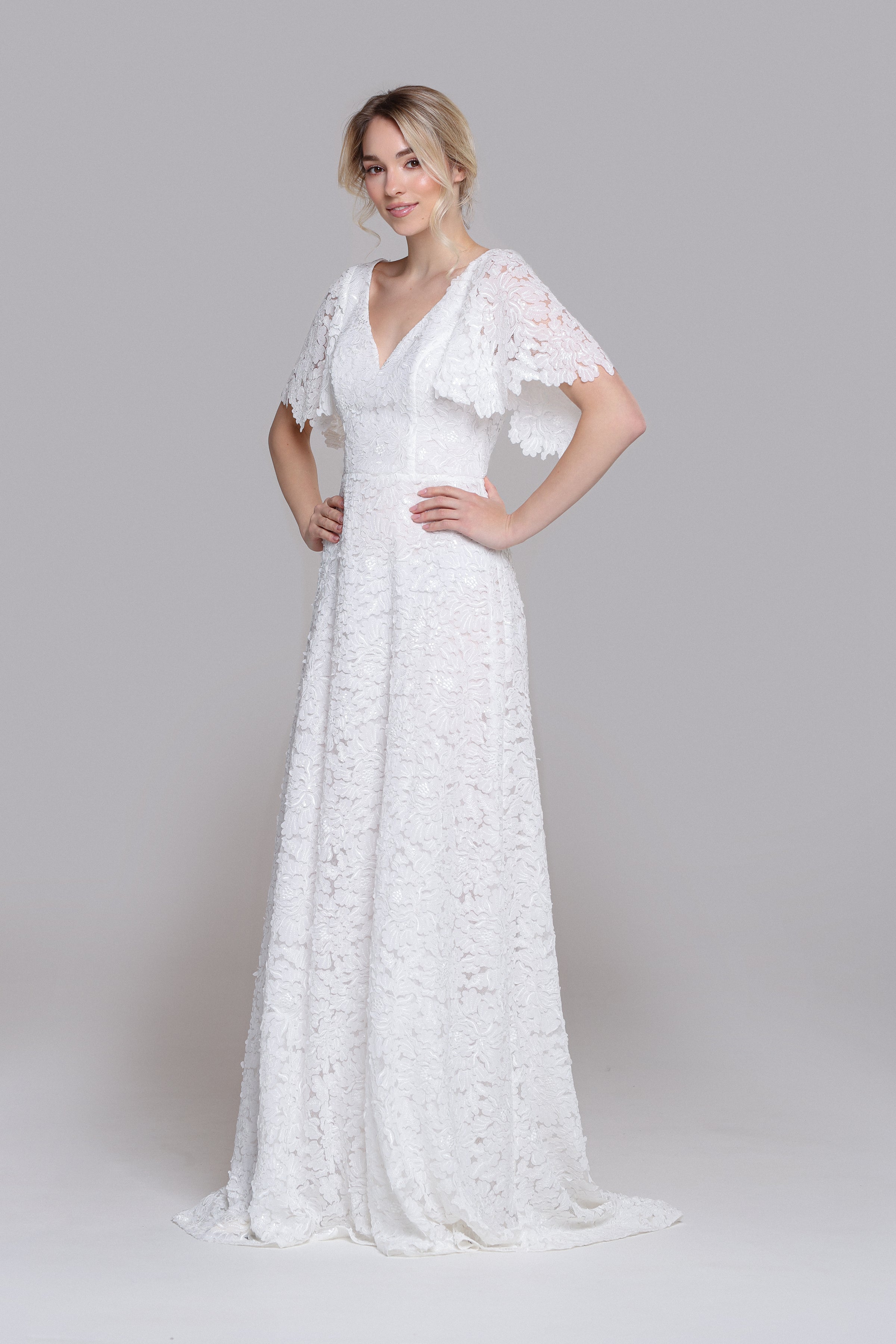 Step into the radiant charm of the VINONA wedding dress, a contemporary gem perfect for breezy civil ceremonies or dreamy garden weddings. Its delicate butterfly sleeves and airy, flowing silhouette create a romantic, chic look that’s effortlessly timeless. Designed for comfort and style, VINONA lets you shine with ease on your special day.